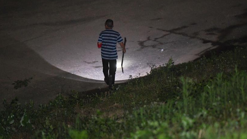在岳陽(yáng)市君山區(qū)的洞庭湖大堤上,工作人員在夜晚巡堤查險(xiǎn)。