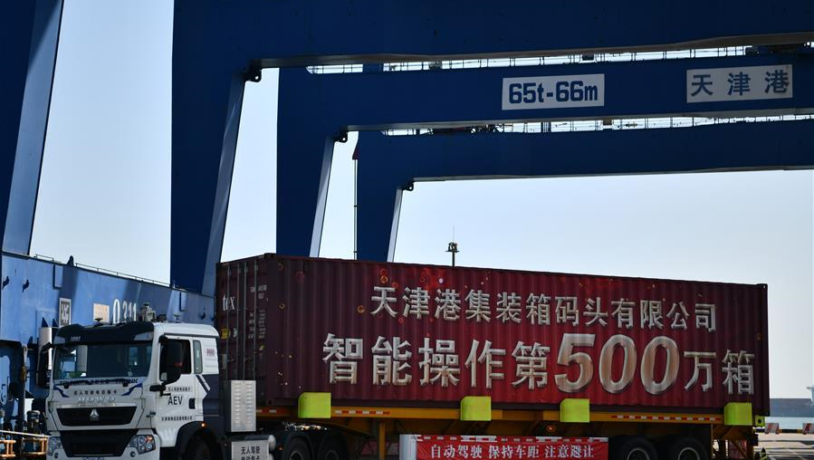在天津港集裝箱碼頭有限公司北區(qū)智能碼頭自動化堆場,裝載著集裝箱的無人駕駛電動集裝箱卡車向碼頭駛?cè)ァ?/p>
