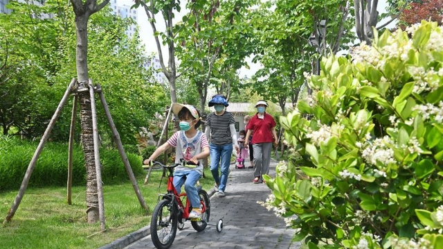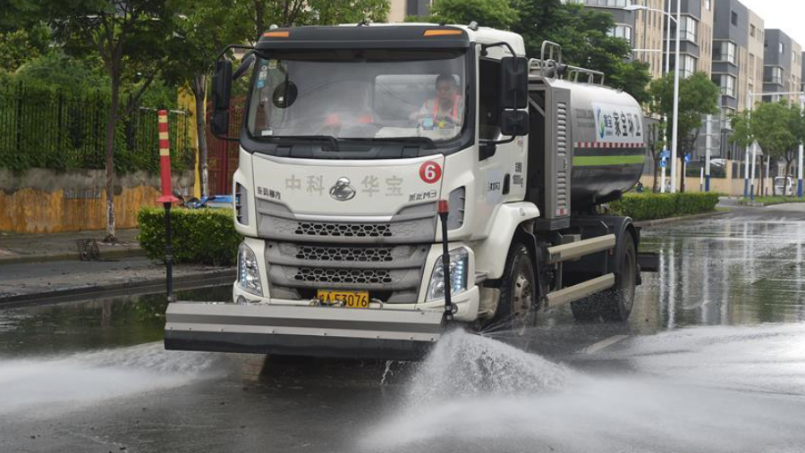 6月15日,在合肥市廬陽經(jīng)濟(jì)開發(fā)區(qū),工作人員駕駛灑水車清潔路面。