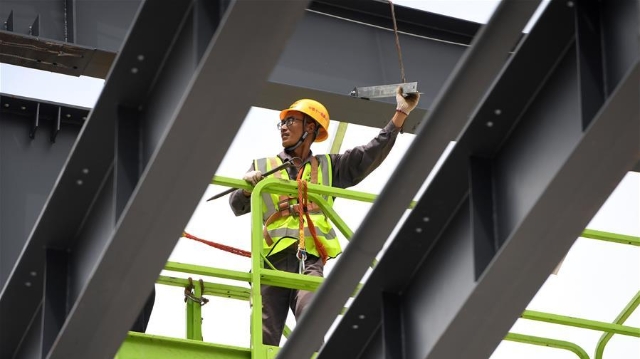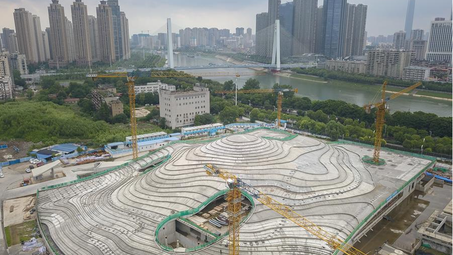 這是6月10日拍攝的已經(jīng)完成主體結構和現(xiàn)場屋面施工的武漢琴臺美術館(無人機照片)。