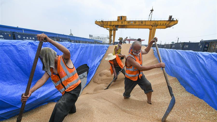 6月10日,在成都糧食集團青白江國家糧食儲備庫,工人在運糧火車的貨廂內(nèi)卸貨。