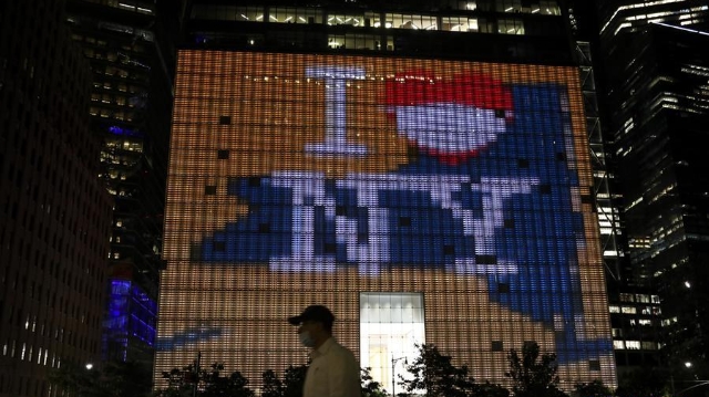 紐約州多處建筑點亮藍色和金色燈光,及用燈光效果呈現(xiàn)出“紐約堅強”、“我愛紐約”等字樣,致敬紐約民眾團結(jié)抗擊疫情。