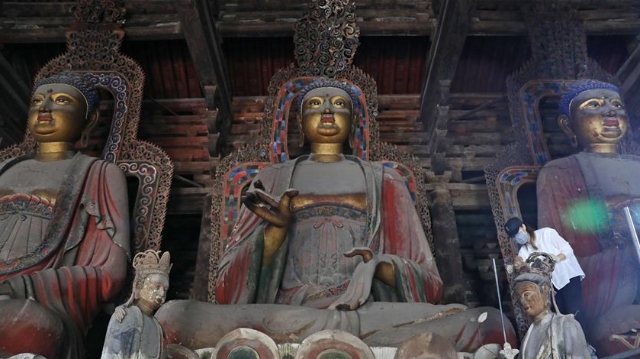 日前,建于1020年的遼寧錦州義縣奉國寺開始進行彩繪泥塑一期保護修復工程。