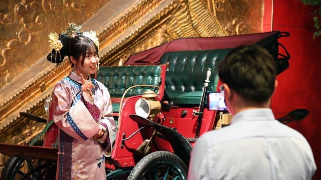 5月18日,在北京汽車博物館,工作人員(左)用講故事的方式通過(guò)網(wǎng)絡(luò)直播平臺(tái)介紹展品。