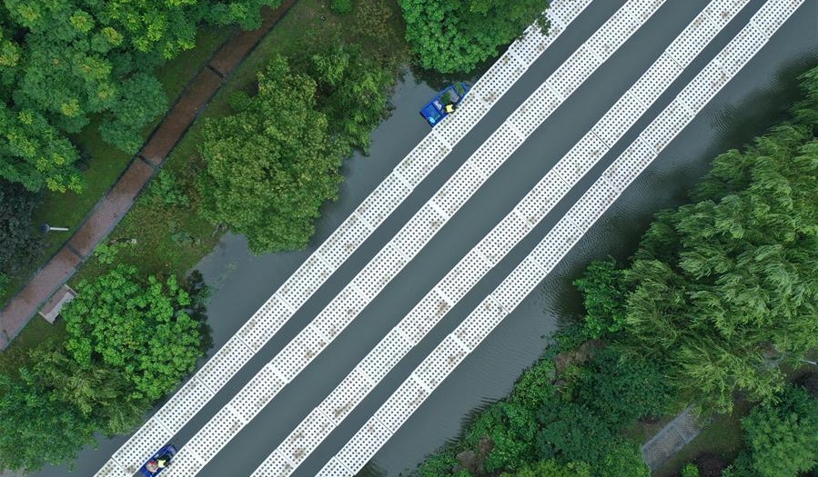 在益陽市大通湖區(qū)東大堤附近水域,一艘船采取“以船代倉”方式儲(chǔ)備防汛物資。