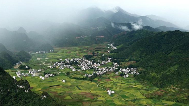 初秋時節(jié),廣西隆林各族自治縣克長鄉(xiāng)田野鋪金,山青水綠,呈現(xiàn)出一幅清新的秋日畫卷。
