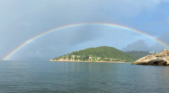 深圳雨后雙彩虹橫跨天際,景象絢麗唯美,引得路人紛紛駐足拍照。