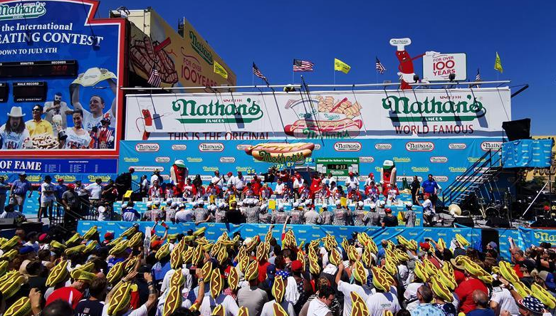7月4日,在美國紐約康尼島,人們觀看吃熱狗大賽。在女子組比賽中,三木須藤10分鐘內(nèi)吃下31個熱狗,連續(xù)第六次贏得冠軍。