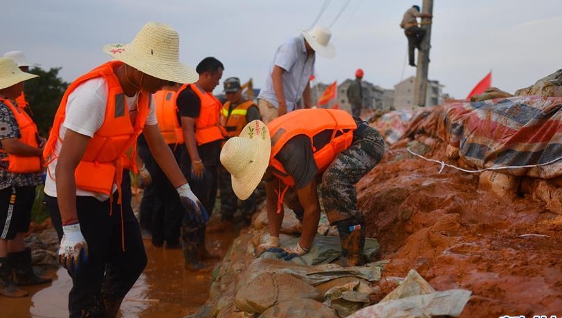 在江西鄱陽縣昌江圩,武警江西總隊(duì)機(jī)動(dòng)支隊(duì)的工作人員和當(dāng)?shù)卮迕褚黄鹂干炒庸疼椎?
