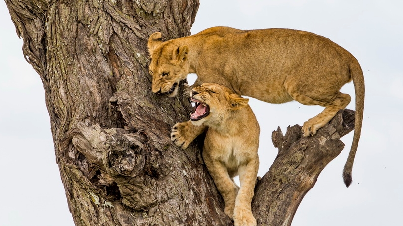 攝影師抓拍獅子上樹畫面 為爭(zhēng)奪位置憤怒咆哮互相攻擊