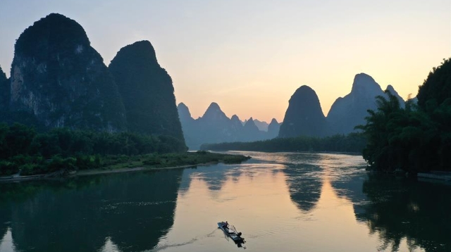 初夏時節(jié),在廣西桂林市陽朔縣興坪鎮(zhèn),藍(lán)天白云下,煙雨朦朧中,桂林山水盡顯秀美。