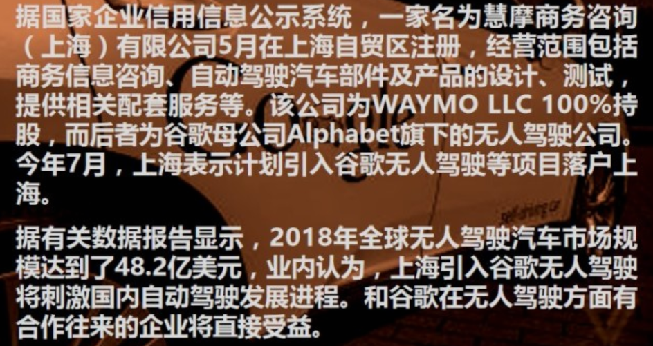 谷歌母公司Alphabet旗下研究自動(dòng)駕駛的部門(mén)Waymo在自動(dòng)駕駛領(lǐng)域處于全球領(lǐng)先水平,當(dāng)前其已經(jīng)完成800萬(wàn)英里(約1287萬(wàn)公里)自動(dòng)駕駛汽車(chē)公共道路測(cè)試,模擬測(cè)試?yán)锍踢_(dá)到50億英里(約80.47億公里)。Waymo計(jì)劃在為今年下半年向部分地區(qū)的美國(guó)消費(fèi)者推出無(wú)人駕駛服務(wù)。