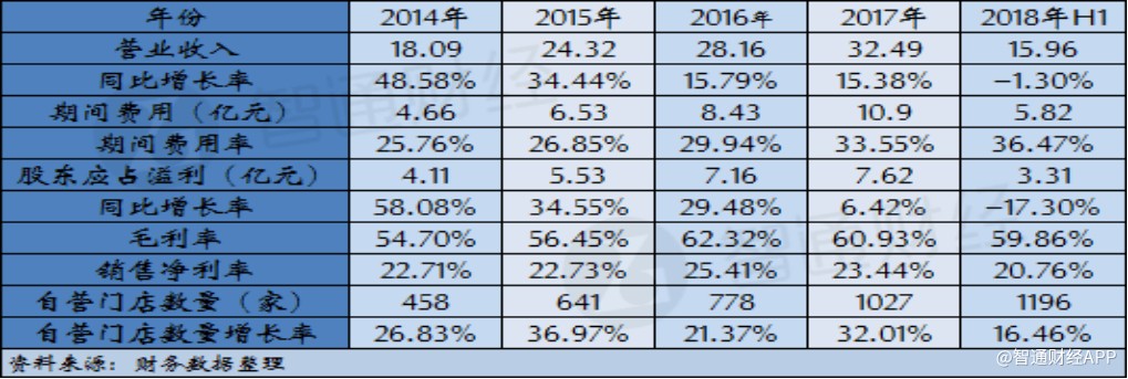 根據(jù)智通財經(jīng)APP的梳理,周黑鴨自營門店數(shù)量在2014年為458家,此后三年公司自營門店數(shù)量每年都有超過20%的增長,但期間公司營業(yè)收入增幅卻呈現(xiàn)放緩的趨勢。與此同時,公司門店數(shù)量的增長也帶來費用率逐年提升,截至2017年,公司期間費用率達(dá)到33.55%,以至于公司凈利潤增速同比下滑超過23個百分點。公司2018年中期財報顯示,上半年公司門店數(shù)量凈增長169家,較2017年增長16.46%,門店數(shù)量快速增長的勢頭雖然的已延續(xù),但卻支撐不起公司營收繼續(xù)保持增長,同時公司期間費用率進(jìn)一步提升至36.47%,導(dǎo)致盈利水平大幅下滑。