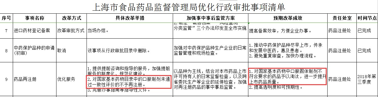 在清單“藥品再注冊(cè)”事項(xiàng)中,明確“加強(qiáng)對(duì)再注冊(cè)藥品的事中事后監(jiān)管”“對(duì)國家基本藥物目錄中口服制劑未通過一致性評(píng)價(jià)的不予再注冊(cè)”“對(duì)國家基本藥物中口服固體制劑不符合要求的藥品予以淘汰”。