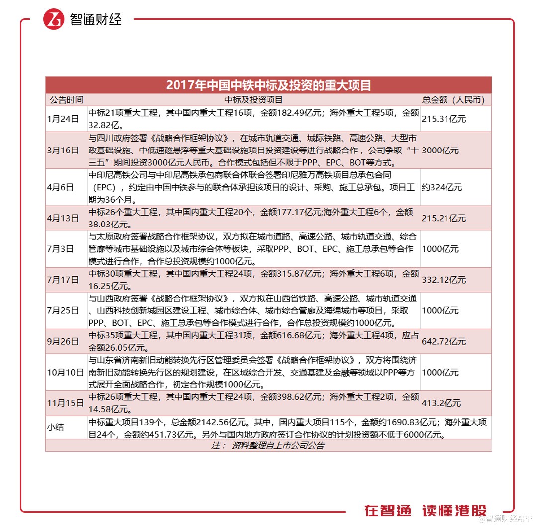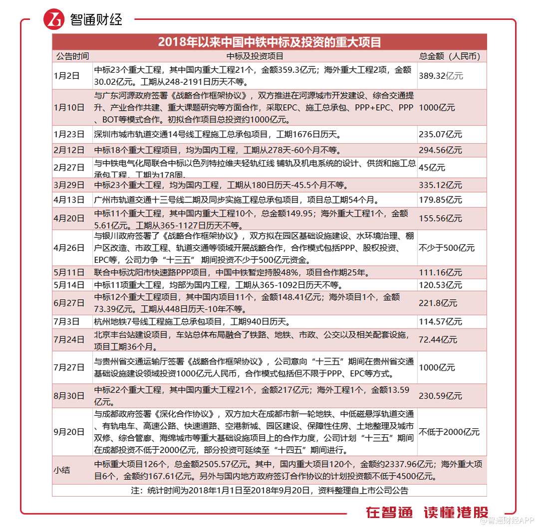 智通財經(jīng)APP注意到,雖然新簽合同金增速放緩,但中標(biāo)的重大項(xiàng)目卻大幅增加。據(jù)披露,中國中鐵上半年中標(biāo)的重大工程項(xiàng)目(不含與地方政府簽訂的戰(zhàn)略合作協(xié)議)達(dá)到102個,而去年同期僅為49個,涉及項(xiàng)目的金額更是后者的近3倍。