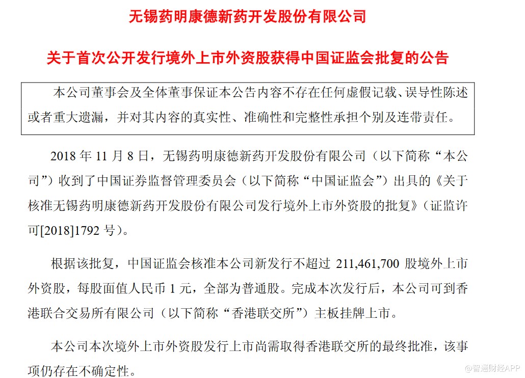 根據(jù)該批復(fù),中國(guó)證監(jiān)會(huì)核準(zhǔn)藥明康德新發(fā)行不超過2.11億股境外上市外資股,每股面值人民幣1元,全部為普通股。完成本次發(fā)行后,藥明康德可到香港聯(lián)交所主板掛牌上市。