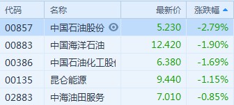 智通財(cái)經(jīng)APP獲悉,受?chē)?guó)際油價(jià)下跌拖累,早盤(pán)石油股全線下滑,截至9時(shí)38分,中石油(00857)跌2.79%,報(bào)價(jià)5.23港元,中海油(00883)跌1.9%,報(bào)12.42港元,中石化(00386)跌1.69%,報(bào)6.38港元,昆侖能源(00135)跌1.15%,報(bào)9.44%港元。