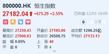 智通財(cái)經(jīng)APP獲悉,中美貿(mào)易摩擦憂慮減退,市場情緒得到提振,恒指早盤高開2.56%,報(bào)27185.66點(diǎn)。全日維持高位震蕩,截至收盤,恒生指數(shù)漲675.29點(diǎn)或2.55%,報(bào)27182.04點(diǎn),全日成交額達(dá)1296.25億。國企指數(shù)漲2.45%,報(bào)10882.16點(diǎn),紅籌指數(shù)漲1.21%,報(bào)4391.2點(diǎn)。