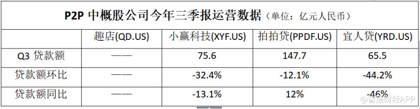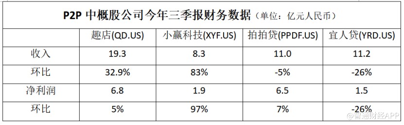 智通財(cái)經(jīng)APP觀察到,在披露三季報(bào)的P2P中概股公司中,趣店(QD.US)收入達(dá)19.3億元(人民幣,單位下同),環(huán)比增長32.9%,同期凈利潤為6.8億元,環(huán)比增長5%;小贏科技(XYF.US)收入為8.3億元,環(huán)比增加83%,凈利潤為1.9億元,環(huán)比增長97%;拍拍貸(PPDF.US)收入為11億元,環(huán)比下跌5%,凈利潤為6.5億元,環(huán)比增長7%;宜人貸(YRD.US)收入為11.2億元,環(huán)比下跌26%,凈利潤為1.5億元,環(huán)比下跌26%。