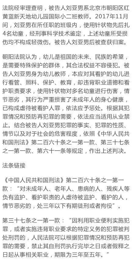 智通財(cái)經(jīng)APP獲悉,12月26日上午,北京市朝陽區(qū)人民法院依法對(duì)被告人劉亞男(紅黃藍(lán)幼兒園教師)虐待被看護(hù)人案公開宣判,以虐待被看護(hù)人罪一審判處劉亞男有期徒刑一年六個(gè)月,同時(shí)禁止其自刑罰執(zhí)行完畢之日或者假釋之日起五年內(nèi)從事未成年人看護(hù)教育工作。(肖順蘭)
