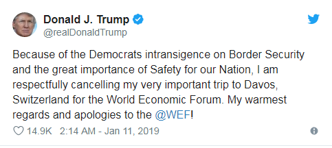 1月11日,美國總統(tǒng)特朗普在推特上發(fā)文稱,他將不會(huì)出席定于1月22日至25日舉行的達(dá)沃斯舉行的世界經(jīng)濟(jì)論壇。