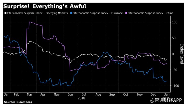 兩位分析師表示,歐洲和新興市場的經(jīng)濟驚喜指數(shù)均陷入負值區(qū)間。而標(biāo)普500指數(shù)成份股公司約有三分之一的營收來自海外,海外市場的進一步疲軟可能最終會令美國國內(nèi)的增長前景變得黯淡。此外,美國國內(nèi)的經(jīng)濟增長前景在一定程度上也已經(jīng)因美國政府部分關(guān)門而減弱。