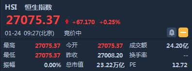 智通財(cái)經(jīng)APP獲悉,恒生指數(shù)開盤高開0.25%,報(bào)27075.37點(diǎn)。國(guó)企指數(shù)漲0.31%,報(bào)10663.49點(diǎn)。紅籌指數(shù)漲0.64%,報(bào)4328.62點(diǎn)。大市盤前成交24.21億港元。隔夜美股震蕩收高,港股ADR全日偏軟。市場(chǎng)對(duì)月底中美談判有所憧憬。