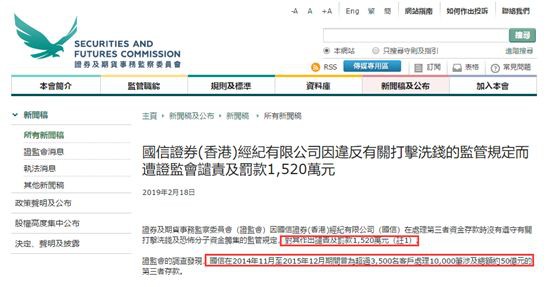 香港證監(jiān)會(huì)調(diào)查發(fā)現(xiàn),國(guó)信證券在2014年11月至2015年12月期間曾為超過3500名客戶處理10000筆涉及總額約50億港元的第三者存款。監(jiān)管特別指出,國(guó)信于為期14個(gè)月的期間,處理了超過2200筆可疑的第三者存款,涉及總額超過23億港元。