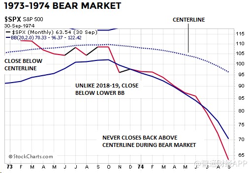 下圖是1973-74年時(shí)的情形,標(biāo)普500指數(shù)在整個(gè)熊市期間都無(wú)法重新回到布林通道中軌之上。與2019年(即到目前為止)不同的是,1973年11月標(biāo)普500指數(shù)收于下軌以下: