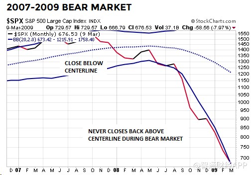 在2007年10月股市見(jiàn)頂之后,標(biāo)普500指數(shù)在2008年1月收于布林通道月線中軌以下,在熊市期間都無(wú)法重新回到布林通道中軌以上。2008年6月標(biāo)普500指數(shù)收于下軌以下: