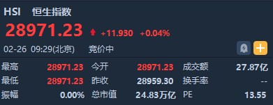 智通財(cái)經(jīng)APP獲悉,恒生指數(shù)開盤漲0.04%%,報(bào)28971.23點(diǎn)。國(guó)企指數(shù)張0.19%,報(bào)11653.15點(diǎn)。紅籌指數(shù)張0.13%,報(bào)4565.49點(diǎn)。大市盤前成交27.87億港元。隔夜美股小幅收漲,大型科技股集體收漲,港股ADR指數(shù)全日僅微升。