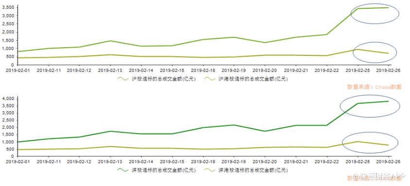 隨著兩地逐漸趨于技術(shù)牛市的形態(tài),2月的滬(深)股通、滬(深)港股通標(biāo)的總成交金額折線一路向上,近兩日驟然上揚。