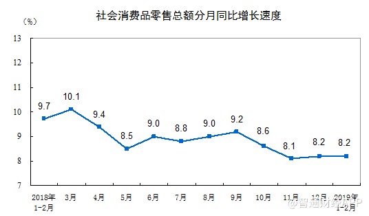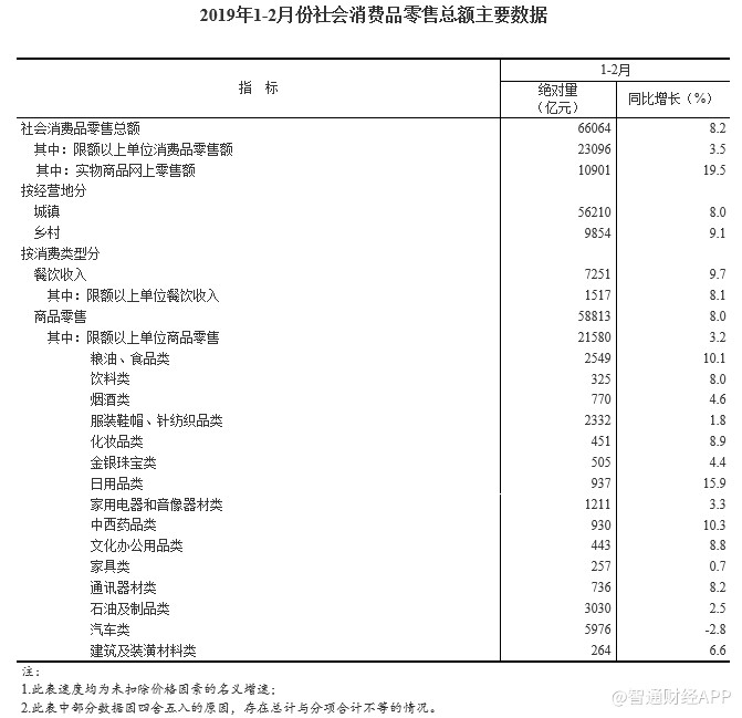 智通財經APP獲悉,國家統(tǒng)計局公布,2019年1-2月份,社會消費品零售總額66064億元,同比名義增長8.2%,符合預期,但低于前值增長9%。其中,限額以上單位消費品零售額23096億元,增長3.5%。