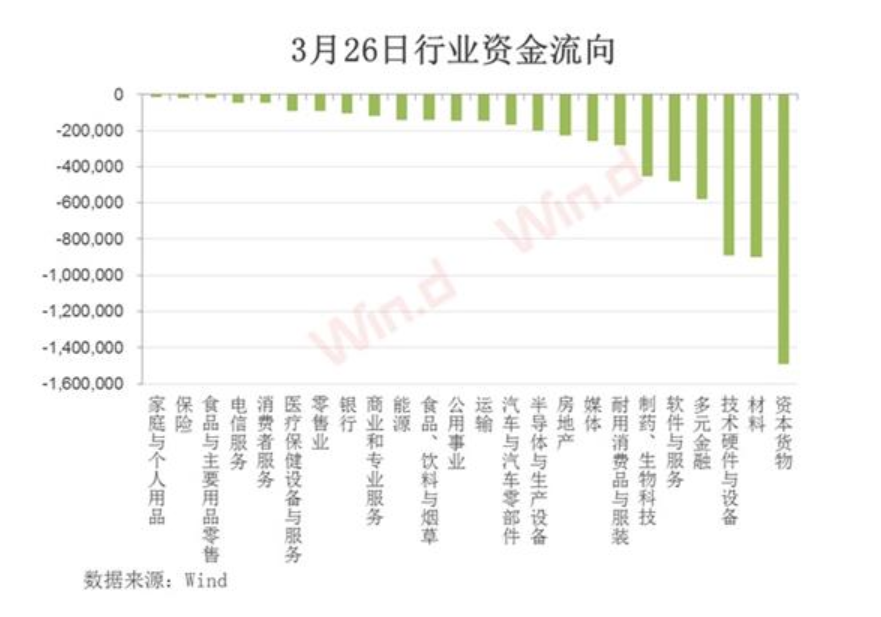 3月26日行業(yè)主力資金流向來看,所有行業(yè)均出現(xiàn)凈流出,累計凈流出逾700億元。其中,資本貨物流出最多,超過140億元;材料、技術(shù)硬件與設(shè)備、多元金融板塊凈流出均超過50億元。