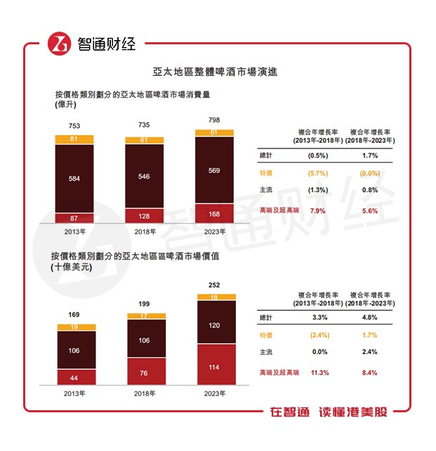 同時,亞太啤酒市場還表現(xiàn)出明顯的高端化趨勢。根據GlobalData的數(shù)據,2018年至2023年,亞太地區(qū)高端及超高端啤酒的銷量會以5.6%的年均復合增長率增長至168億升,市場價值則以8.4%的年均復合增長率增長至1140億元。