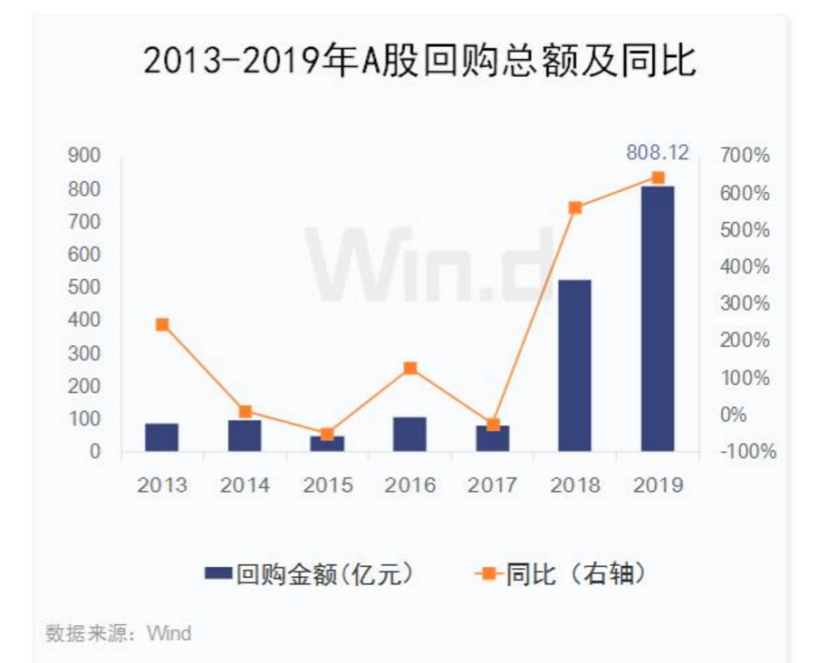 2019年初至今,兩市已有711家公司實(shí)施了回購(gòu)計(jì)劃,總回購(gòu)金額遠(yuǎn)超去年全年,達(dá)808.12億元,同比增長(zhǎng)6.43倍,2018年同期回購(gòu)總規(guī)模為108.76億元。