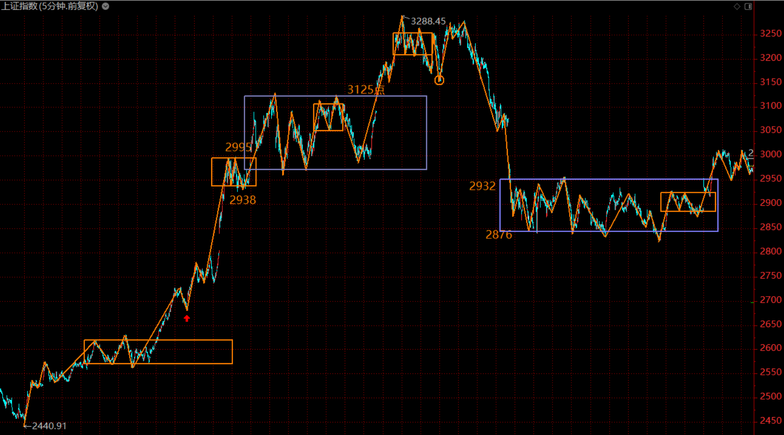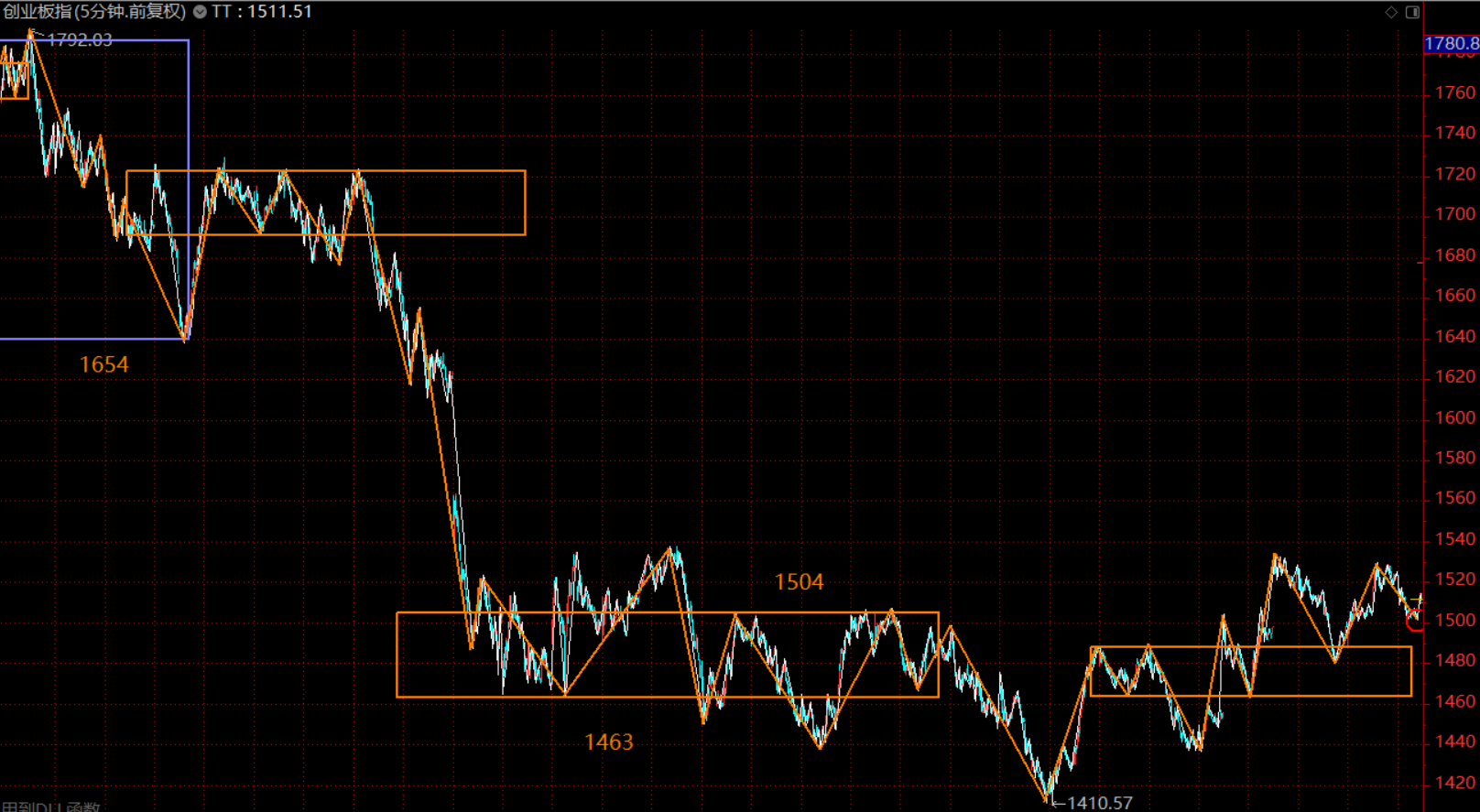 創(chuàng)業(yè)板這里未拉離最后一個(gè)30分鐘中樞(1463-1504),在中樞上軌附近橫盤(pán),這里做同級(jí)別分解后,紅圈圈位置為五分鐘級(jí)別的第三類買(mǎi)點(diǎn)。因此,綜合兩個(gè)股指,周初市場(chǎng)上漲,后半段需轉(zhuǎn)入防守,逐步縮減倉(cāng)位,以應(yīng)對(duì)回調(diào)。