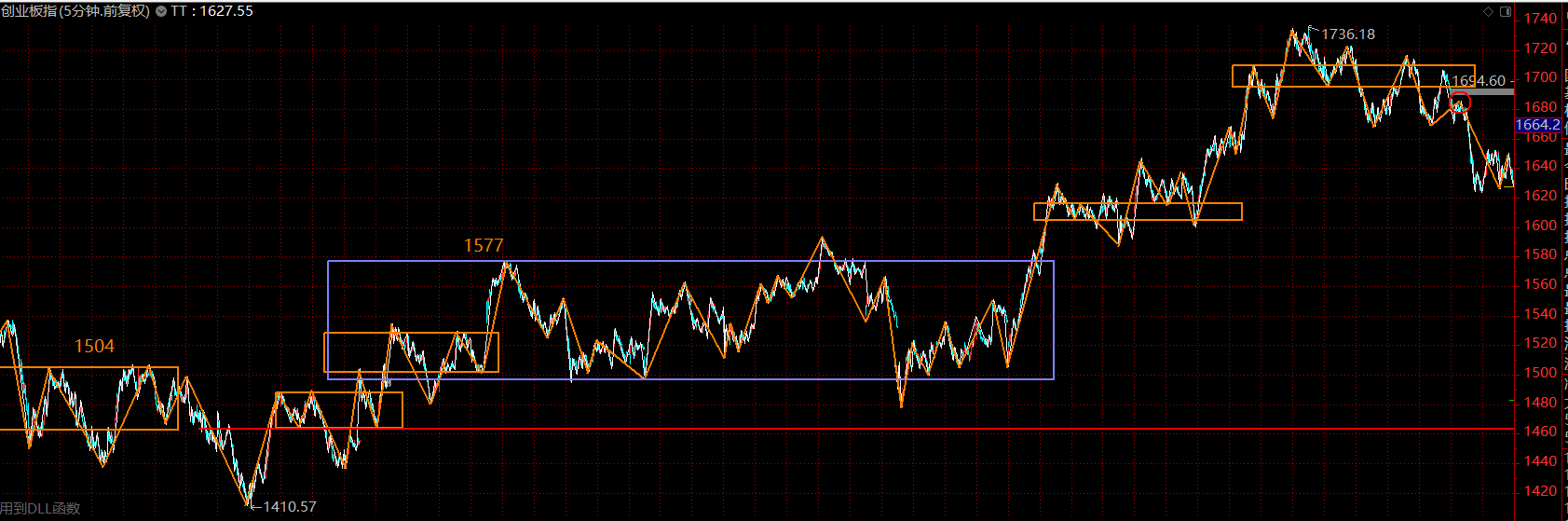 本輪行情的領(lǐng)先指數(shù)——創(chuàng)業(yè)板指數(shù)仍舊為多頭排列,目前同樣進入了五分鐘下跌趨勢第二個中樞的構(gòu)建過程,可依托1600-1620區(qū)域展開布局。