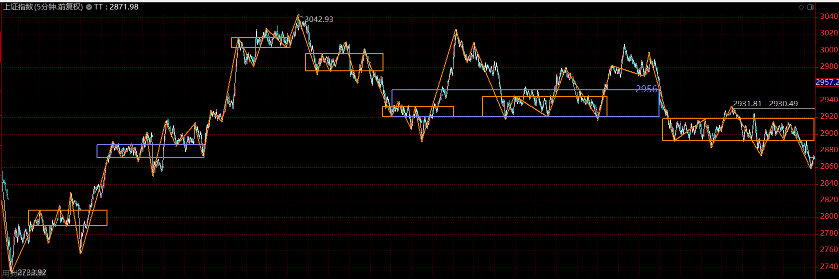 上證指數(shù)上周在等待中樞擴展完成后破位下跌,破位力度比較小,而對結(jié)構分解后發(fā)現(xiàn),這次大中樞的盤整背馳,第一段以五分鐘趨勢的形式完成,第二段以盤整的形式完成,且已進入了尾聲。因此,料此輪主跌段不會太久,繼續(xù)維持在前序中樞下軌2850附近企穩(wěn)的判斷。