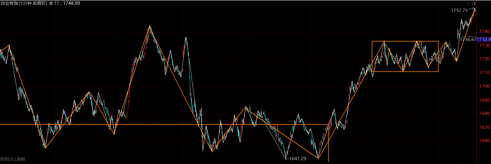 創(chuàng)業(yè)板本周創(chuàng)下八個(gè)月新高,完成了歐奈爾杯柄的一次突破,下一步要面臨1792點(diǎn)的前高大壓力位。日K線看,這個(gè)位置需要橫盤整固一段時(shí)間,同時(shí)也利于構(gòu)建下方中樞的第三類買點(diǎn)。小級別看,同樣是運(yùn)行良好的多頭趨勢,目前在背馳段里,本周初的回踩只要不跌破1735點(diǎn),均可以安心持股待漲。