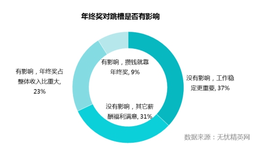 但是即便大部分人對(duì)今年的年終獎(jiǎng)的增長沒有信心,卻很難讓他們因?yàn)槟杲K獎(jiǎng)而跳槽。半數(shù)以上的受訪者年終獎(jiǎng)?wù)既晔杖氲谋壤齼H為20%左右,即便不滿意年終獎(jiǎng),但工作的穩(wěn)定性、工作環(huán)境、企業(yè)福利是他們更看重的要素。有3成受訪者表示收入依賴年終獎(jiǎng),如果年終獎(jiǎng)不滿意一定會(huì)尋找機(jī)會(huì)跳槽。因此企業(yè)在人才管理上,需要特別注意年終獎(jiǎng)對(duì)于員工保留的影響,提前做好預(yù)防工作。