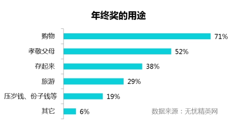 在年終獎(jiǎng)的使用上,71%的人會(huì)用于購物,52%的人會(huì)用于孝敬父母,38%的人會(huì)將年終獎(jiǎng)存一部分起來,29%的會(huì)用于旅行。超過一半的人,以上年終獎(jiǎng)的使用類別超過了3項(xiàng),人生的那點(diǎn)小夢(mèng)想,全仰仗年終獎(jiǎng)?!捌綍r(shí)每個(gè)月還完房貸,收入只夠生活,提升生活質(zhì)量,全靠年終獎(jiǎng),去年的年終獎(jiǎng),我給自己買了臺(tái)蘋果筆記本電腦;今年的年終獎(jiǎng),準(zhǔn)備用來去普吉島旅行,沒有年終獎(jiǎng)肯定要哭死?!?剛在上海買了房的小杰告訴我們。