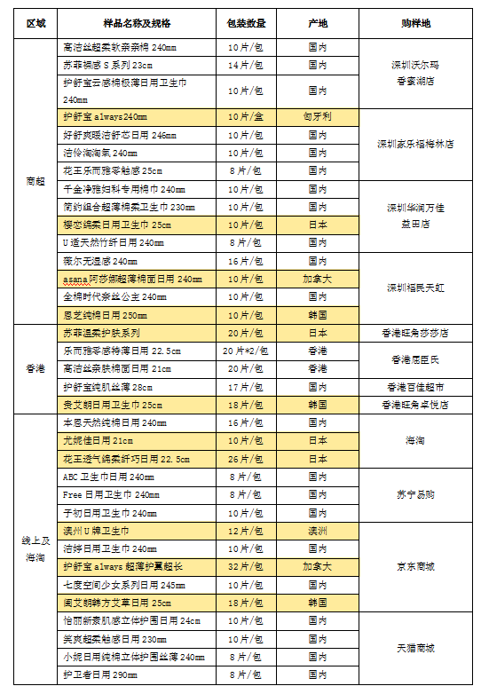 據(jù)前期調研發(fā)現(xiàn),國外品牌衛(wèi)生巾更受女性消費者青睞,很多消費者認為國外品牌衛(wèi)生巾質量更優(yōu)更值得信賴,進而選擇跨境或海淘等方式購買國外產品。因此,本次樣品分別從深圳商超、香港、線上海淘購買樣品進行測試和比較,樣品涉及11款國外原裝產品。詳見下表。