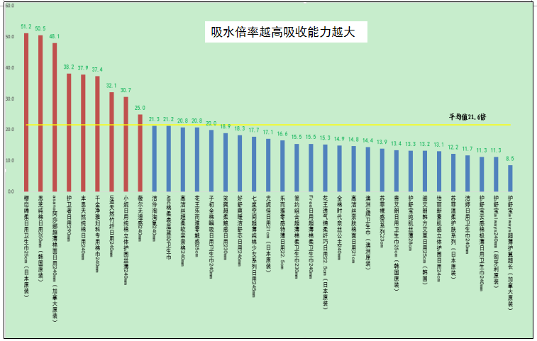 2.35款衛(wèi)生巾吸水倍率有差別,吸水倍率最高的前三名和最低的三款均為國外品牌。