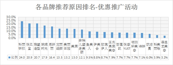 優(yōu)惠推廣活動(dòng)推薦率排名:排名前三的是科麗研肌、悅己堂、雅望造型。
