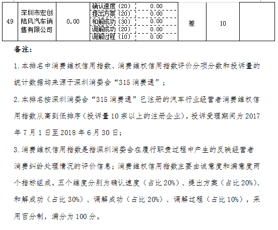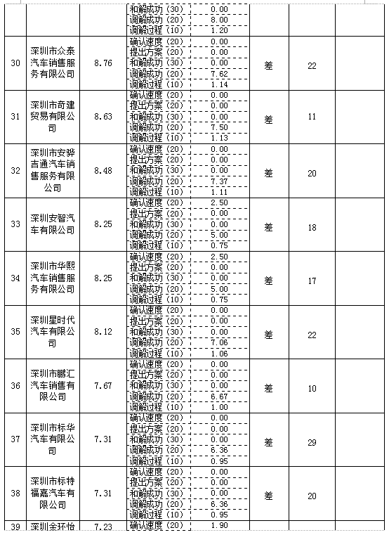 在細(xì)分指標(biāo)方面,深圳市標(biāo)域汽車有限公司、深圳標(biāo)特汽車(集團(tuán))有限公司和深圳市宏創(chuàng)陸風(fēng)汽車銷售有限公司等27家企業(yè)處理投訴不及時,未積極與消費(fèi)者先行和解,導(dǎo)致其企業(yè)“確認(rèn)速度”、“提出方案”和“和解成功”三項(xiàng)分項(xiàng)指標(biāo)的分?jǐn)?shù)皆為0,嚴(yán)重影響了企業(yè)的消費(fèi)維權(quán)信用指數(shù)和信用等級。深圳市仁孚特力汽車服務(wù)有限公司、深圳市安進(jìn)汽車貿(mào)易有限公司和深圳市大興寶譽(yù)汽車銷售服務(wù)有限公司在由消委會工作人員評分的“調(diào)解過程”分項(xiàng)指標(biāo)分?jǐn)?shù)為負(fù)分,3家企業(yè)存在不配合調(diào)解甚至拒絕調(diào)解的情況,解決消費(fèi)糾紛的誠意度較差;另外,深圳市宏創(chuàng)陸風(fēng)汽車銷售有限公司的消費(fèi)維權(quán)信用指數(shù)為0,誠意度和滿意度為0,10宗消費(fèi)投訴皆未處理成功,排名最后。