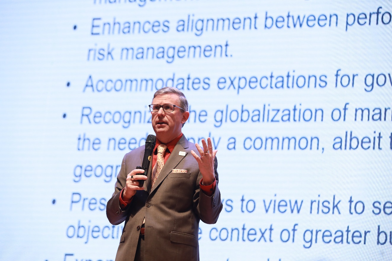 IMA總裁兼首席執(zhí)行官 Jeffrey Thomson以“企業(yè)風(fēng)險(xiǎn)管理——風(fēng)險(xiǎn)與戰(zhàn)略和績效協(xié)調(diào)一致”為主題,圍繞美國反虛假財(cái)務(wù)報(bào)告委員會下屬的發(fā)起人委員會C OSO的企業(yè)風(fēng)險(xiǎn)管理最新框架,與現(xiàn)場嘉賓分享了企業(yè)風(fēng)險(xiǎn)管理所需要注意的問題。Thomson表示,風(fēng)險(xiǎn)管理并非單一孤立,而應(yīng)當(dāng)貫穿于戰(zhàn)略制定、績效考核、內(nèi)部控制等企業(yè)管理的方方面面。他強(qiáng)調(diào),風(fēng)險(xiǎn)管理并非是“杜絕”風(fēng)險(xiǎn),而更重要的是確定風(fēng)險(xiǎn)偏好,管控風(fēng)險(xiǎn)的同時分析發(fā)現(xiàn)企業(yè)發(fā)展的機(jī)遇。