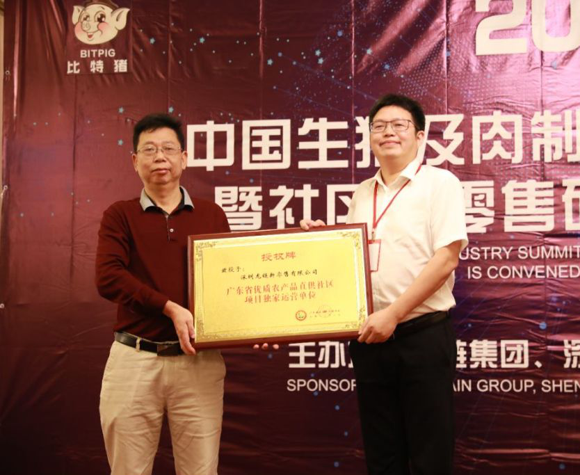 龍鏈集團董事局主席、川豬集團董事長、深圳龍鏈新零售有限公司董事長夏可,上臺接受了這項全廣東省獨家的授權牌,并發(fā)表感言:這既是廣東省委、省政府對深圳龍鏈新零售有限公司以區(qū)塊鏈、人工智能、物聯(lián)網等領域的高新科技,打造形成了生豬及肉制品等高品質“菜籃子工程”系列產品的規(guī)?;I(yè)化產供銷及商業(yè)平臺服務“一條龍”的肯定,也是一種鞭策——鞭策龍鏈人將自創(chuàng)的“比特豬”品牌穩(wěn)固為中國高端健康食品結合社區(qū)新零售領域的第一品牌,并不斷推動市民能夠以更便捷的方式與更良好的消費體驗,獲得高品質的放心食品。