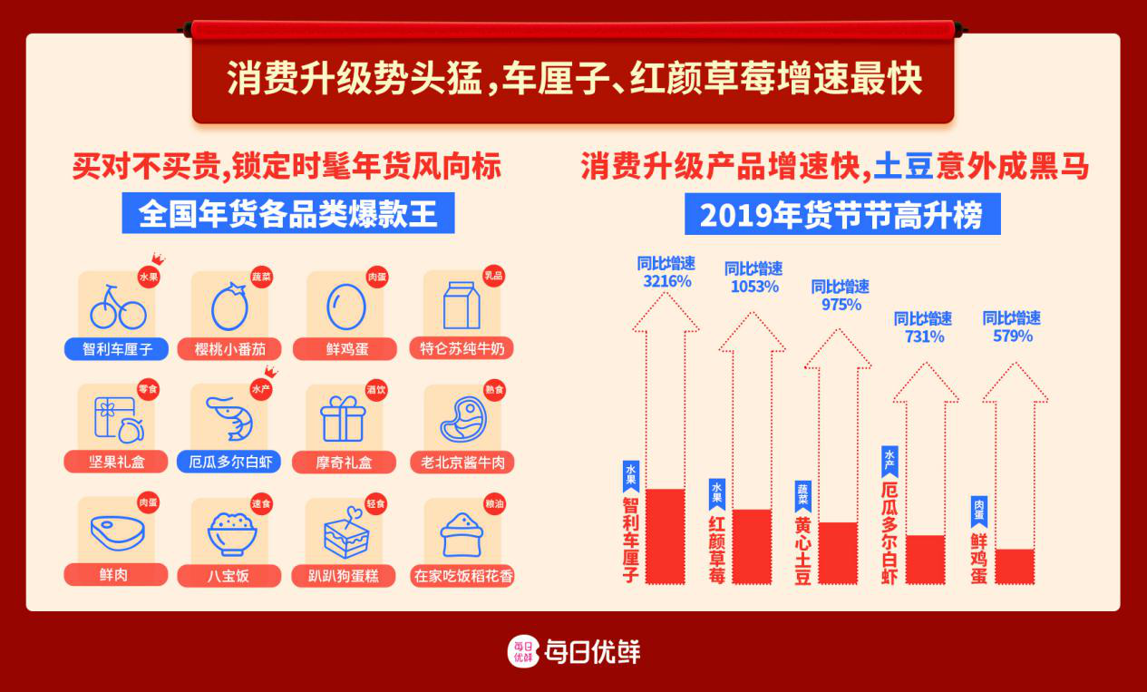 每日優(yōu)鮮華南區(qū)負(fù)責(zé)人告訴記者,智利車?yán)遄釉谌A南區(qū)的銷量已經(jīng)超過(guò)了100萬(wàn)斤,在華南年貨頻道里,水果、肉蛋、酒水等品類占據(jù)“大半壁江山”,高端水果的銷售占比更是從去年的20%激增到50%。除了車?yán)遄?,消費(fèi)者還十分喜歡上上簽砂糖桔、臘味禮盒、箱裝牛奶和零食大禮包等。