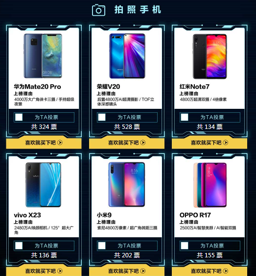 在手機(jī)類產(chǎn)品投票中,拍照手機(jī)候選產(chǎn)品分別為:華為Mate20 Pro、榮耀V20、紅米Note7、vivo X23、小米9和OPPO R17,截至3月12日榮耀V20暫時(shí)領(lǐng)先。